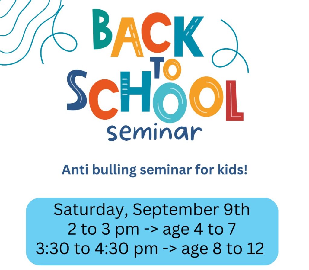 Join us in this fun seminar! Get your kids ready to get back to school by preparing them to protect themselves against bullies. In this seminar, we are going to teach essential techniques that will empower our kids. Hurry up! Limited spots available.